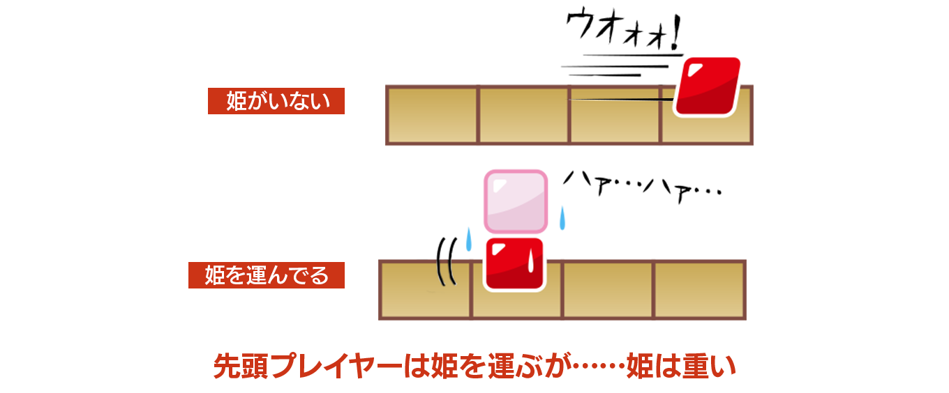 しかし先頭プレイヤーは魔女の呪いによって体重が重くなった姫を担ぐため、進みが遅くなるという制限が……。